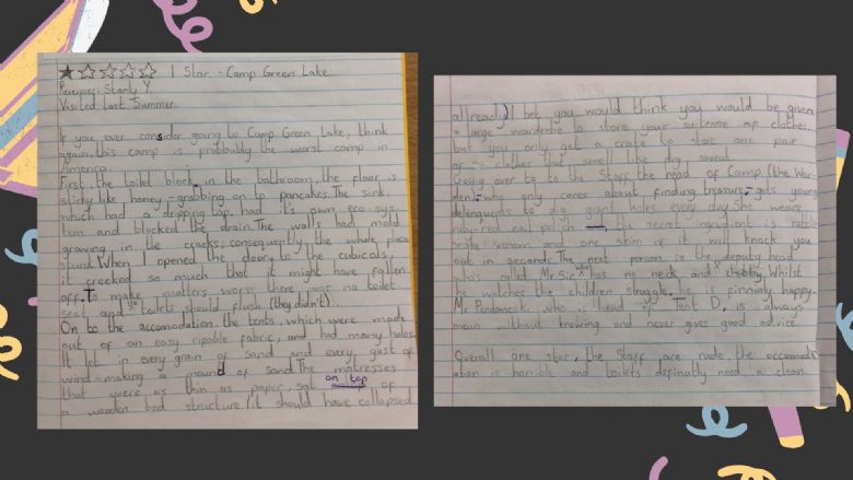 In English, we have look at the text Holes by Louis Sachar. We have written reviews of Camp Green Lake from the persepctive of Stanley Yelnats.